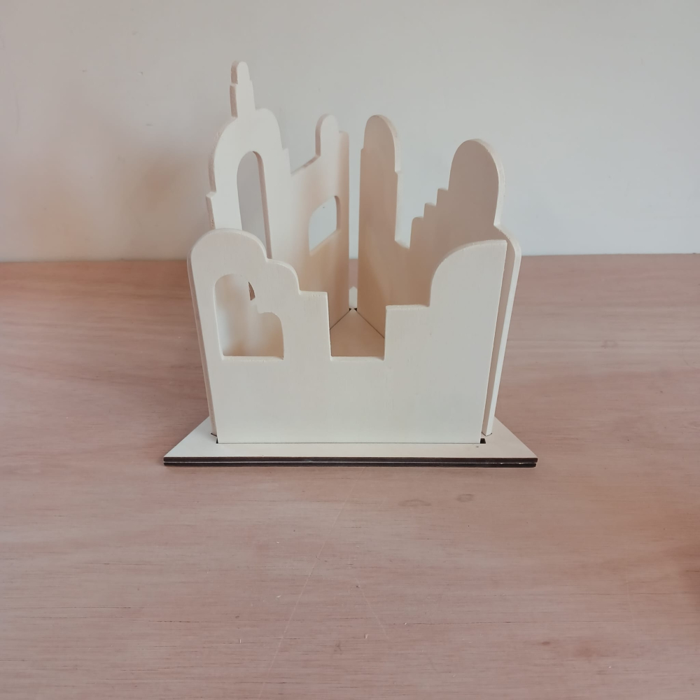 Dit bestaat uit 4 onderdelen, een driehoekige onderplaat, waar 3 delen van de muur in gezet kunnen worden. Het is plat op te bergen.