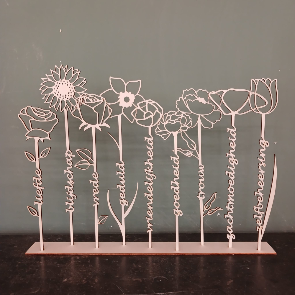 De houder is 55 cm breed en 6 cm diep. De bloemen zijn tussen de 32 en 40 cm hoog. Let wel op bij het insteken van de bloemen in de houder, want het is kwetsbaar. Eventueel gebroken bloemen kunt u nabestellen.