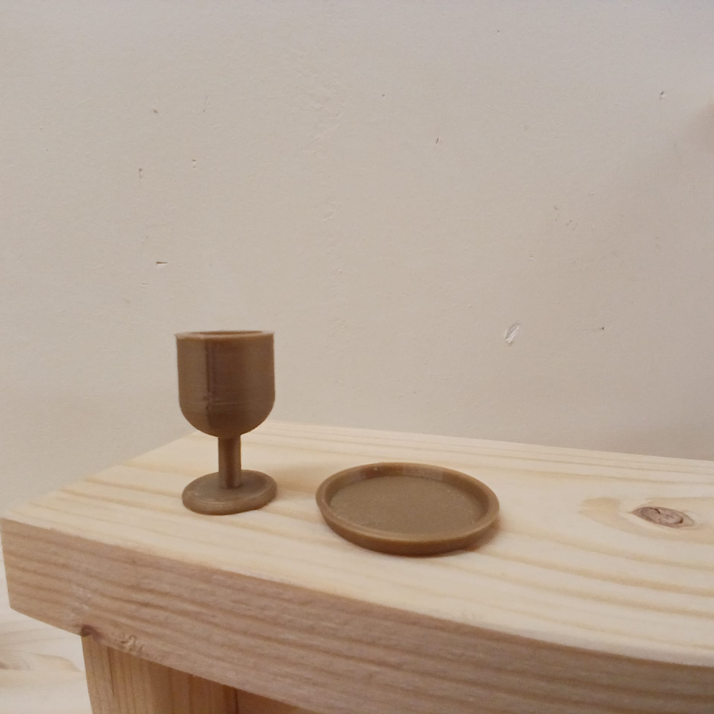 - kelk en bord, donker goud gekleurd (glanst niet)