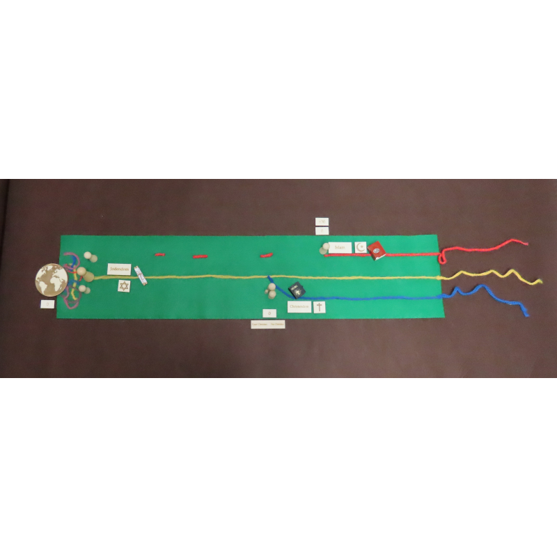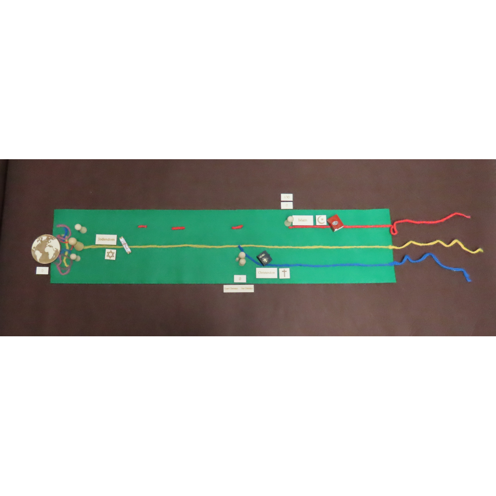 Lange groene strook vilt met daarop drie koorden van ieder een verschillende kleur, geel, blauw en donkerrood