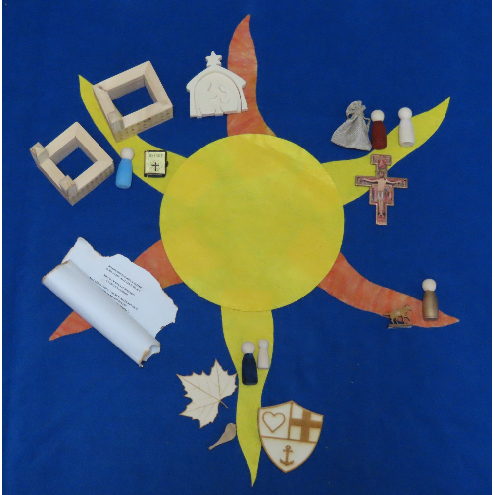 Gele ronde zon met zes losse stralen, drie helder gele en drie diep gele.