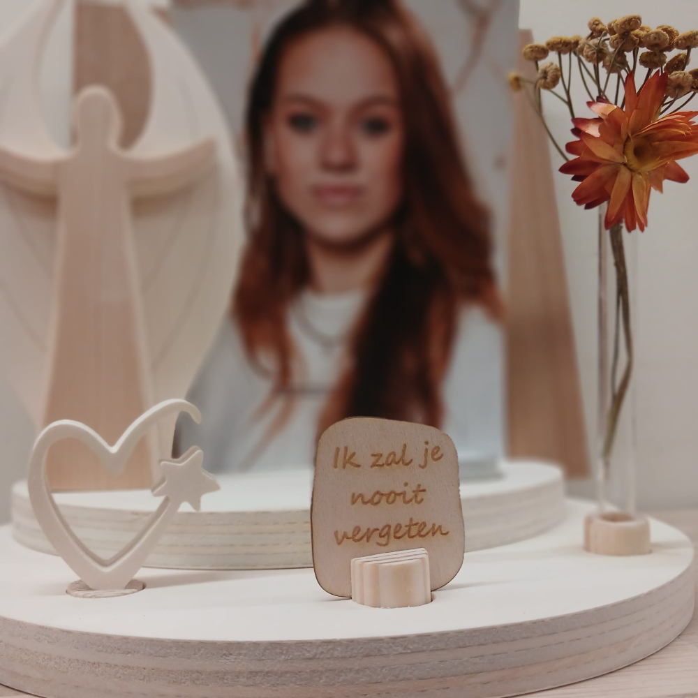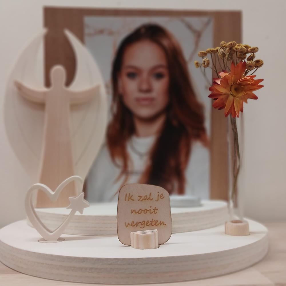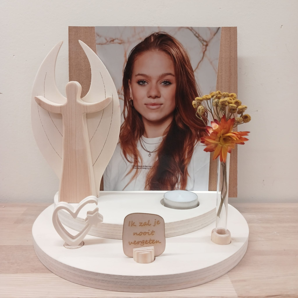 Er is ruimte voor een (rouw)kaart of foto, en het wordt geleverd met de houten engel, een gat voor een waxinelichtje en de drie figuurtjes voorin, het hartje, het houten bordje met de tekst 'Ik zal je nooit vergeten' en het vaasje (zonder de droogbloemetjes).