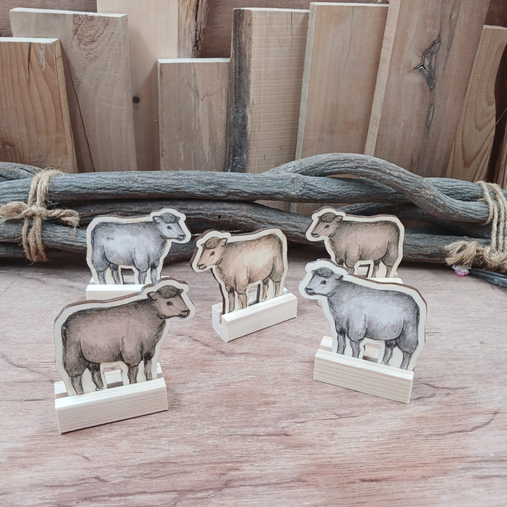 Te koop als DIY pakket: je ontvangt dan houten silhouetten met voetjes, en twee afbeeldingen op papier, eenttje van de voorzijde en eentje van de achterzijde. Deze kun je uitknippen en vervolgens op het houten silhouet plakken (let goed op dat je de juiste kant beplakt, ze zijn niet allemaal symetrisch. Het opplakken kun je goed doen met spuitlijm, deze is als optie mee te bestellen.