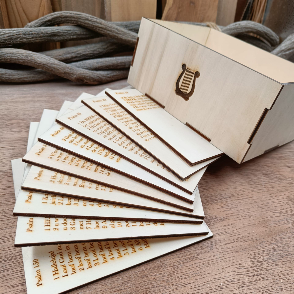 1 bewaarbox met gravering van een harp, 18 cm bij 14 cm en 8,5 cm hoog.